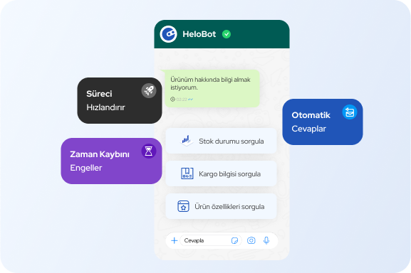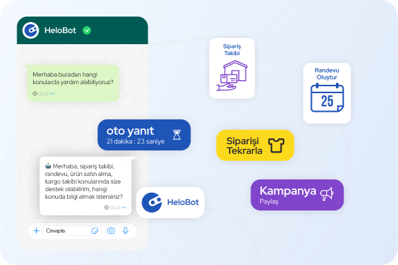 HeloBot, sadece mesajlaşma ve yanıt verme ile sınırlı değildir; aynı zamanda işletmelerin otomatik süreç yönetimini de kolaylaştırır. Sipariş takibi, müşteri randevuları, yeniden satış fırsatları gibi işlemleri HeloBot üzerinden otomatikleştirerek işletmelerin operasyonel yükünü hafifletirsiniz. Bot, belirli süreçleri otomatikleştirerek insan gücü gereksinimini azaltır ve verimliliği artırır.