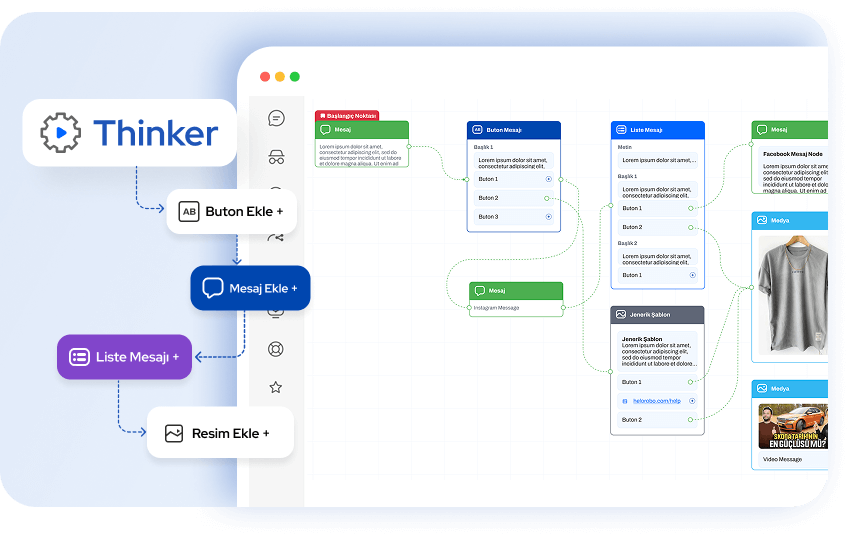 Thinker, HeloRobo'nun sunduğu güçlü bir yapılandırılmış mesaj akış modülüdür. İşletmelere müşteri destek süreçlerini hızlandırma, otomatik yanıtlar verme ve müşteri etkileşimlerini daha verimli yönetme imkanı tanır.